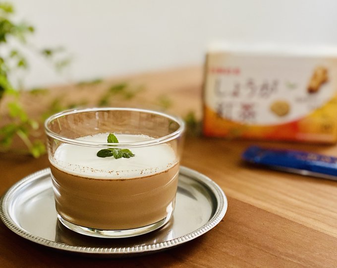しょうが紅茶と、お湯にサッと溶かすだけで手軽に楽しめるインスタントティー「ロイヤルミルクティー」を使った「チャイプリン」。混ぜて固めるだけの簡単レシピです。